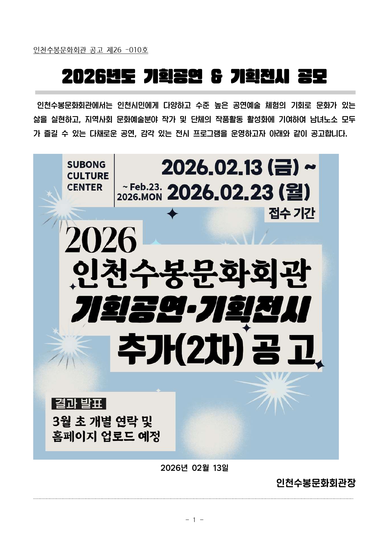 [공모안내] 2026년도 기획공연 & 기획전시 공모 추가 안내 2026-02-13 |