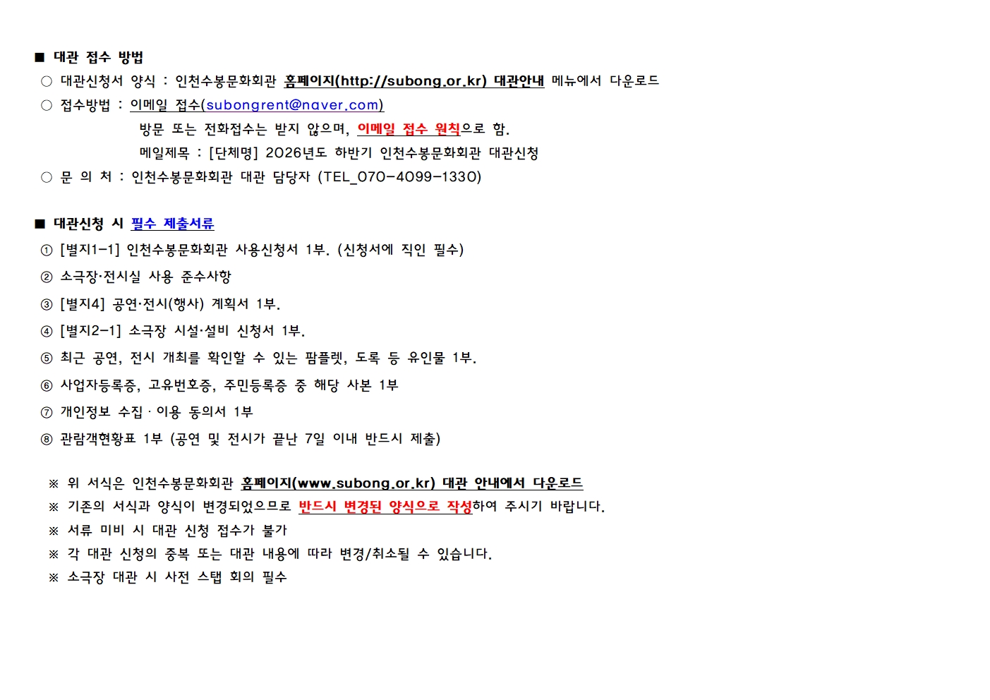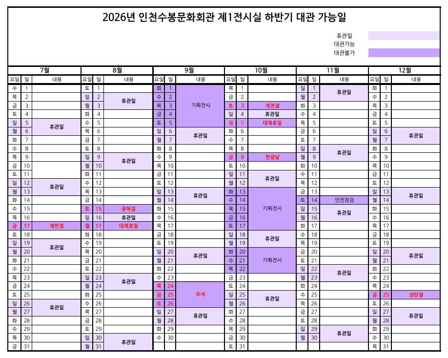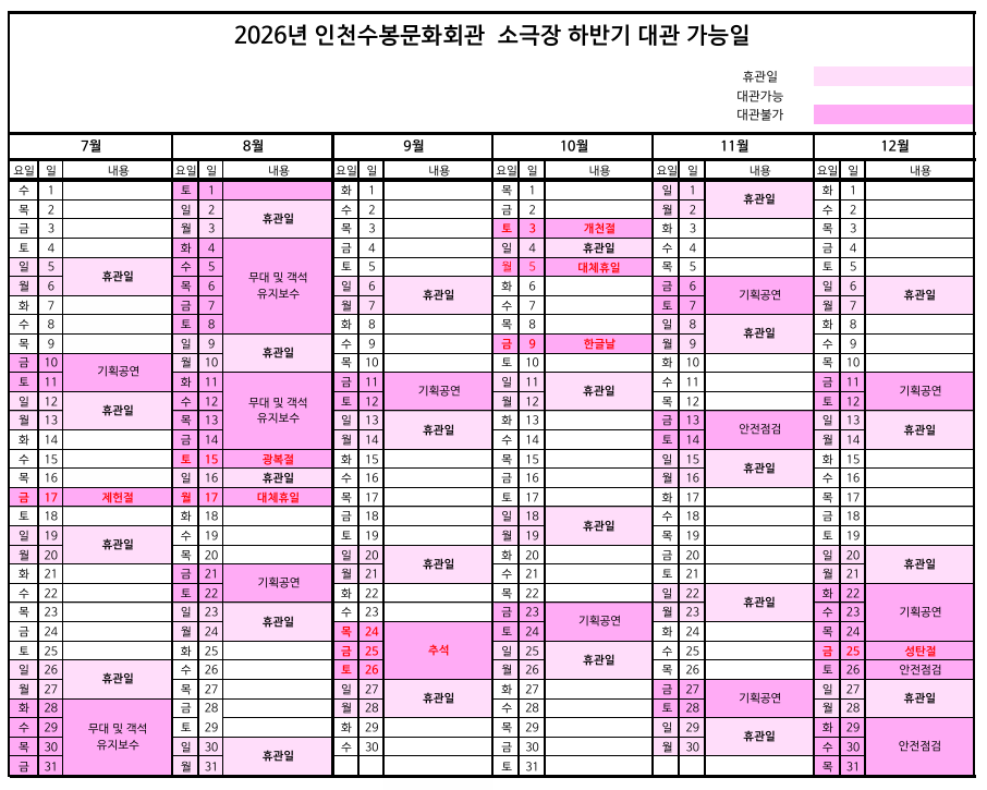 인천수봉문화회관 2026년 하반기 정기대관 공고